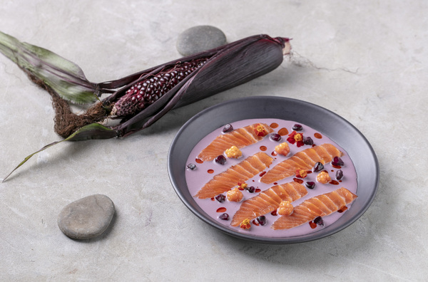 Форель / кукуруза / копченый перец – ломтики форели в соусе из редкого сорта фермерской кукурузы каберне, чьи зерна похожи на зерна граната, несколько часов томились в молоке, с маслом вяленых копченых перцев, ягодами морошки и цветами.
