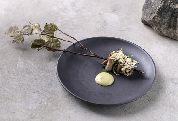 Язык оленя / плоды настурции / корень хрена – нежный язык оленя, капуста мизуна и маринованные плоды настурции – продукт, который в отличие от листьев настурции, крайне редко используется на кухне. Блюдо дополняется соусом из хрена и черемши и подается на березовой ветке.