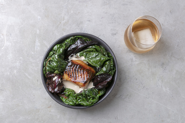 Черная треска / мангольд / мисо из гороха – филе трески глазируется мисо из гороха и карамели и подается в гнезде жаренного на гриле мангольда с соусом из молочного фундука, сливок, лука и вина.