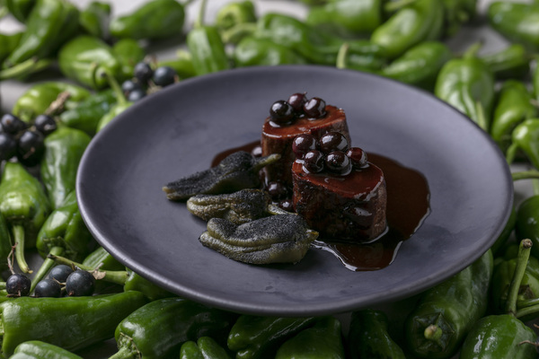 Кабан / перцы / смородина – вырезка кабана, обжаренные на гриле фермерские перцы Padrón и соус из дикой смородины (второе её название – репис) и хереса. Подача дополнена свежими ягодами дикой смородины.
