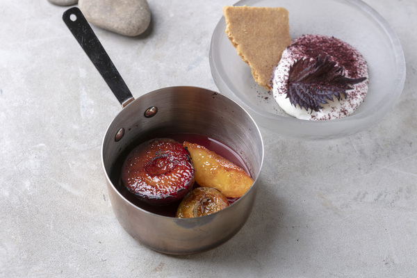 Слива / скир / миндаль – томленые сезонные сливы (актуальный сорт выбирается каждую неделю) в сочетании с муссом из мягкого исландского сыра Скир, миндальным печеньем и листьями шисо, а также посыпкой из дегидрированной кожуры сливы.